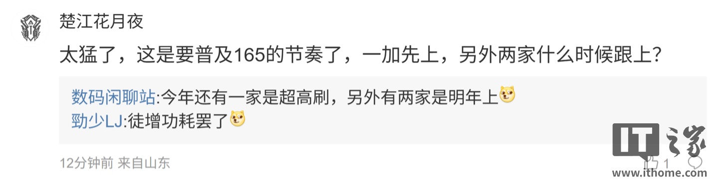 后续有用户在评论区询问:“太猛了,这是要普及 165 的节奏了,一加先上,另外两家什么时候跟上?”,博主回复道:“今年还有一家是超高刷,另外有两家是明年上 ”;另一名用户则表示:“还要啥充电宝