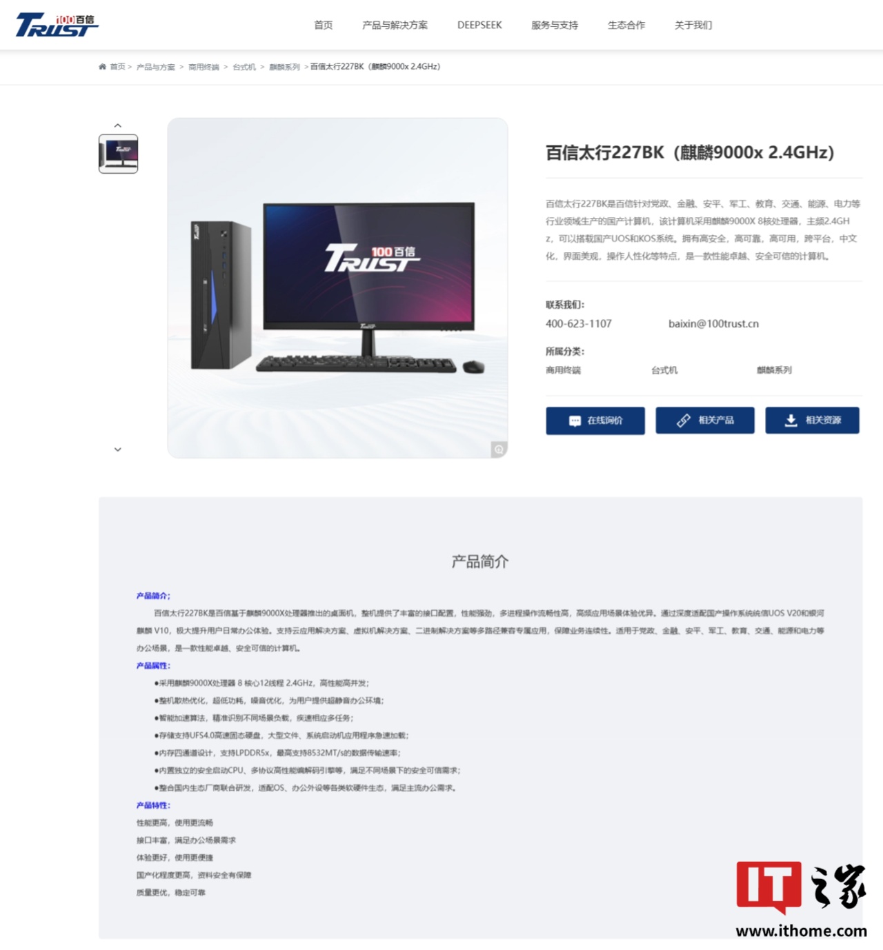 IT之家从百信官网获悉,百信太行 227BK 是百信基于麒麟 9000X 处理器推出的桌面机,深度适配国产操作系统统信 UOS V20 和银河麒麟 V10,支持云应用解决方案、虚拟机解决方案、二进制解决方案等多路径兼容专属应用,适用于党政、金融、安平、军工、教育、交通、能源和电力等办公场景。
