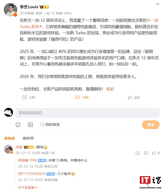 IT之家 12 月 15 日消息,OPPO 员工 @帅蓝 昨日发布视频,分享了一加中国区总裁李杰在品牌 12 周年现场的爆料:一加将在下个月推出全新的 Turbo 系列,新机主打“游戏性能好、续航非常好”。