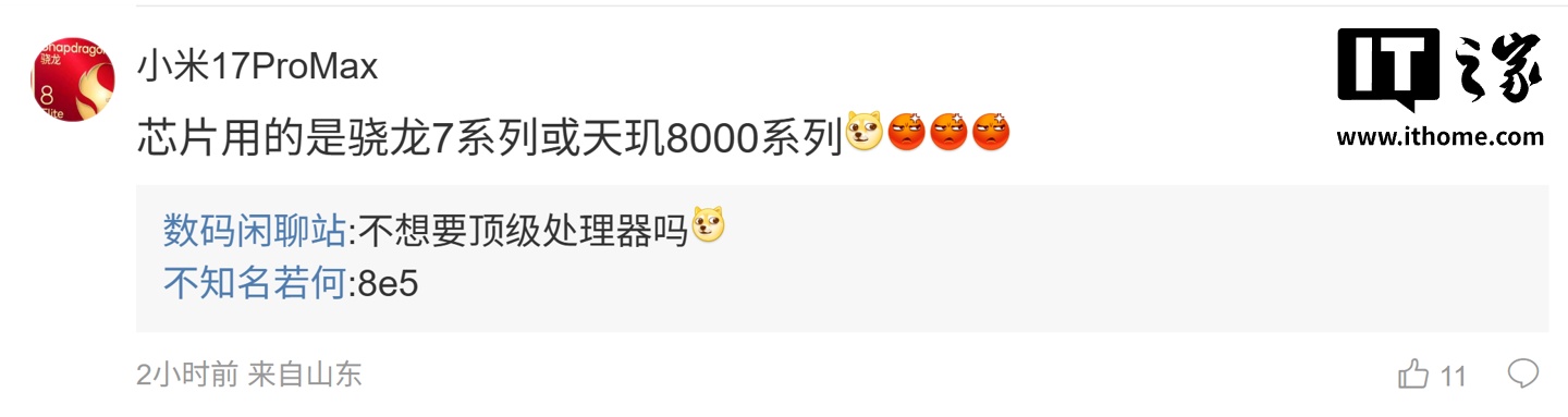 后续有用户在评论区询问:“为什么厚度不做到 9.5mm 再增加点电池”,博主回复道:“真就完全不考虑手感了?”;另一名用户则询问道:“芯片用的是骁龙 7 系列或天玑 800 系列