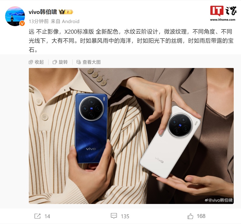 IT之家 9 月 26 日消息,vivo 通信科技有限公司产品经理 @vivo韩伯啸 今天下午公布了 X200 标准版的真机,并披露该机型的全新配色。从图片来看,该机提供蓝、白两款配色,蓝色则采用新的微波纹理设计,不同角度或光线下的视觉效果亦有不同。