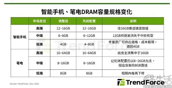 想要渡过困境,各大手机厂商就必然会在牺牲出货量、提升售价或是降低配置之间做出抉择。TrendForce方面认为,手机厂商选择缩减配置的概率相当之大,除了溢价空间更大的旗舰机将维持12GB、16GB内存配置,中端机将放弃12GB内存,主推6GB、8GB版本,低端的入门机则会弃用8GB内存,主推4GB版本。