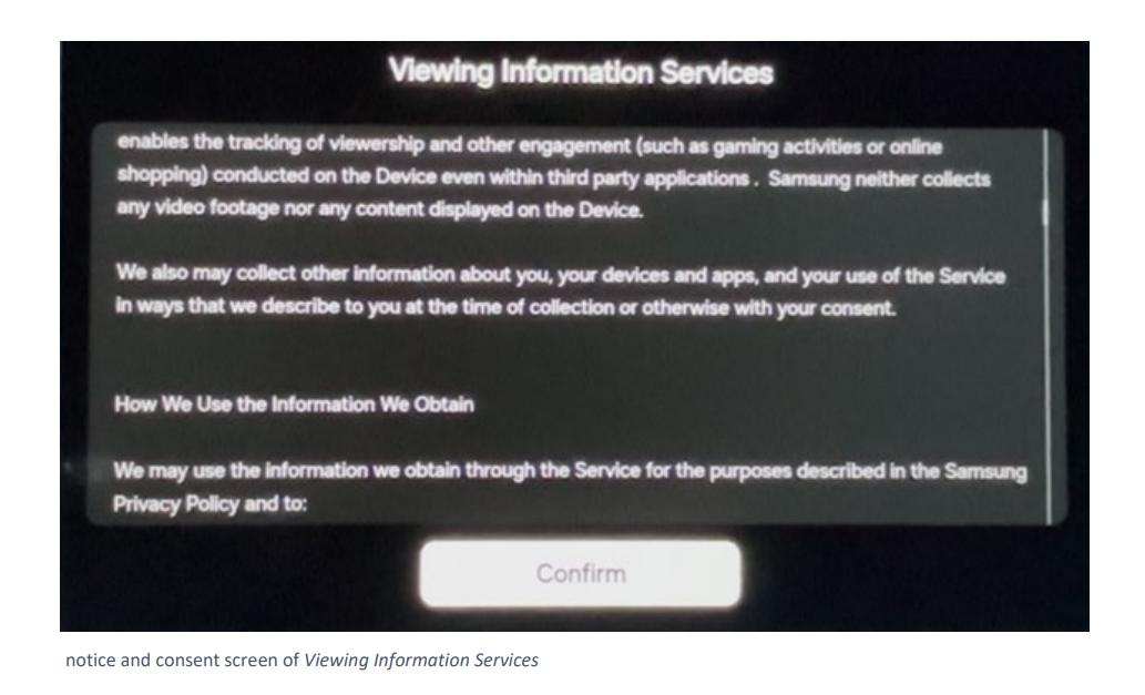 起诉书指出这五大制造商为获取数据,设计了极具欺骗性的用户界面。以三星为例,诉讼指出其在开机设置中引导用户开启 ACR。
