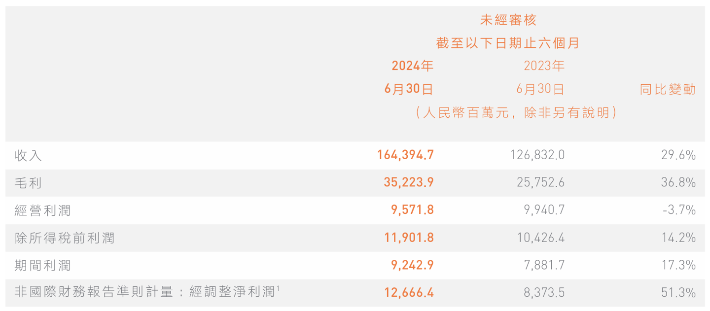 智能手机收入由 2023 年上半年的 716 亿元增加 29.9% 至 2024 年上半年的 930 亿元