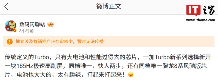 IT之家 12 月 17 日消息,博主 @数码闲聊站 今日发文透露,一加 Turbo 新系列机型新开了一块 165Hz 极速高刷屏,同档唯一。新机还搭载同档唯一骁龙 8 系风驰版芯片,并采用大容量电池设计。