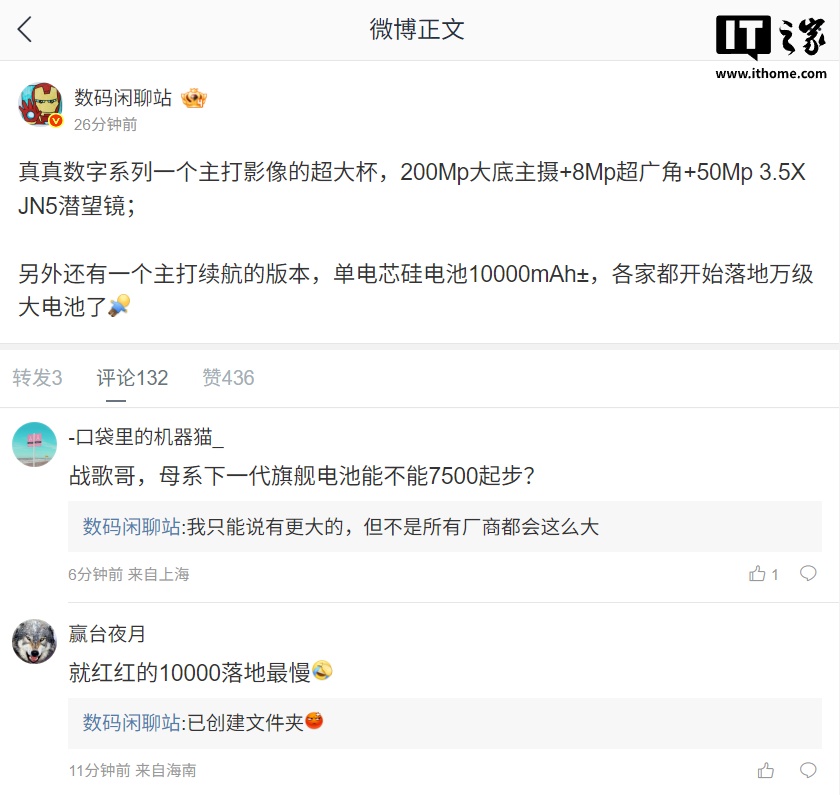 有网友询问“母系下一代旗舰电池能不能 7500 起步”,该博主表示“我只能说有更大的,但不是所有厂商都会这么大”。