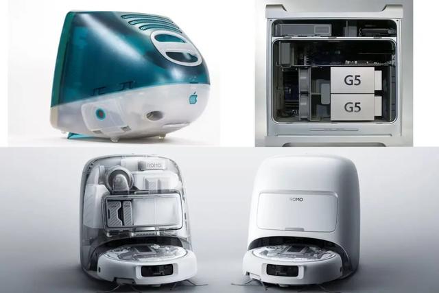 ROMO 扫地机外壳设计参考苹果初代 iMac 的透明水母造型。外露的零部件像苹果 Power Mac G5 的内部一样经过设计,不显杂乱。
