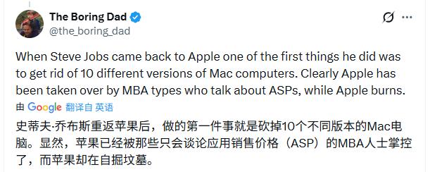 更有评论回溯历史,认为苹果已经逐渐背离了乔布斯时代“专注打造极致精品”的产品哲学。在当前由职业经理人主导、更注重财务指标(如平均售价)的运营模式下,产品线日趋复杂化,这或许在短期内能带来财务收益,但长期来看可能损害其以创新和简洁著称的品牌根基。
