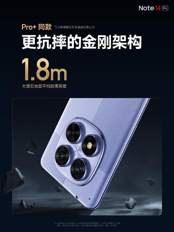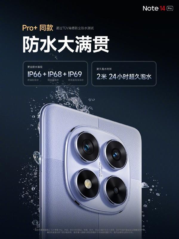 不仅如此,Redmi Note 14 Pro具有同款金刚架构,通过1.8米跌落测试,并且具备IP66+IP68+IP69 防水大满贯。