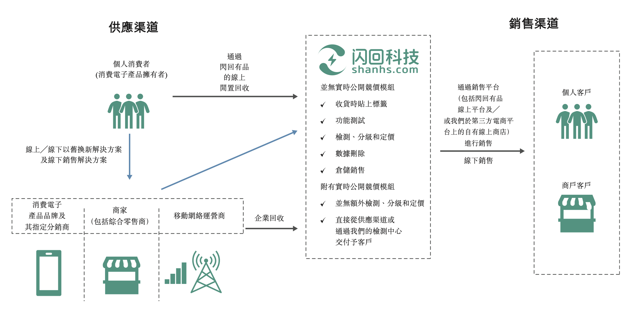 根据闪回科技(闪回收)上市申请文件的介绍,其业务模式可以分为两个部分:回收与销售。回收指闪回收作为回收平台,从个人消费者和企业(分销商、零售商、运营商)回收闲置数码产品。回收的产品经闪回科技处理后,会进入到销售的部分,由自有平台(闪回有品)和第三方电商中的自营商店二次出售给个人或商户。