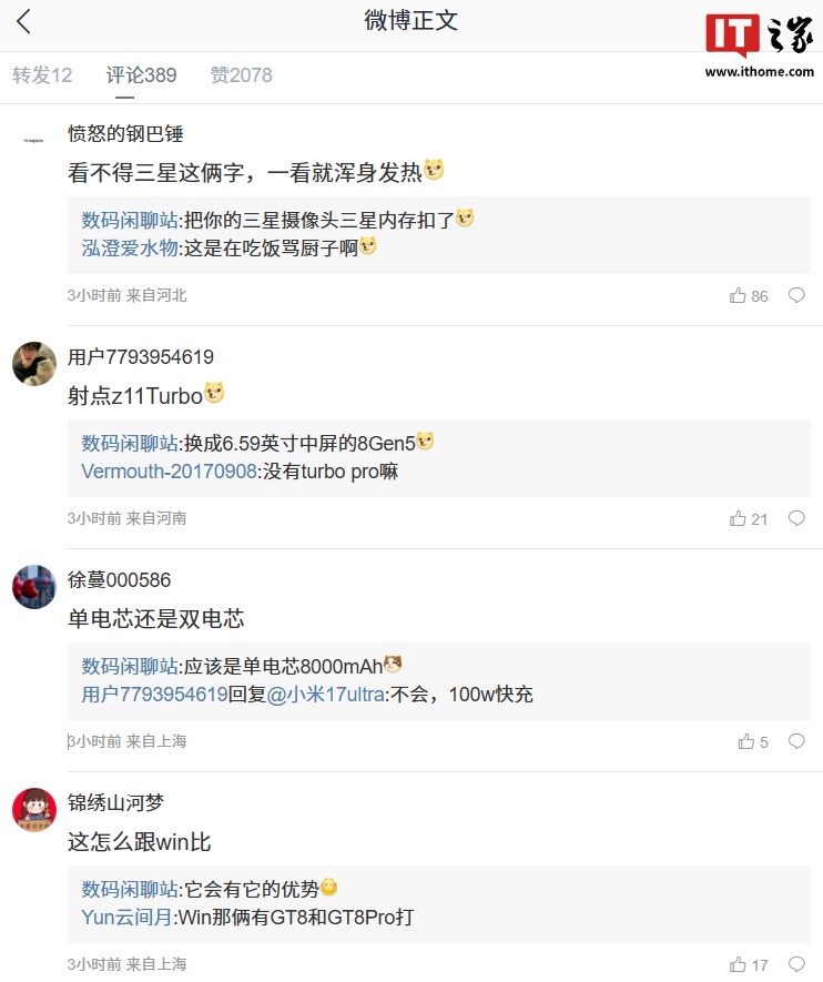 博主还在评论区回复了部分网友的问题:针对新机采用单电芯还是双电芯设计,他回复:“应该是单电芯 8000mAh。”针对新机能否和荣耀 WIN 系列做对比,他表示:“它会有它的优势。”另外,博主还透露了 iQOO Z11 Turbo 新机的信息:“换成 6.59 英寸中屏的 8 Gen5。”