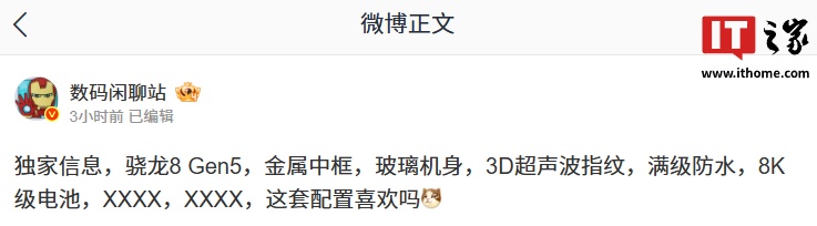 IT之家 12 月 18 日消息,博主 @数码闲聊站 今日发文爆料了一款骁龙 8 Gen5 处理器的新机,其配备金属中框 + 玻璃机身 + 3D 超声波指纹 + 满级防水,同时内置 8000mAh 级别的电池,还有两项隐藏亮点。