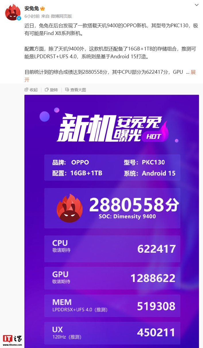 测试机型跑分超 288 万,搭载联发科天玑 9400 处理器,系统基于 Android 15 打造,该机还配备 16GB+1TB 的存储组合,安兔兔官方推测“可能是 LPDDR5T+UFS 4.0”。