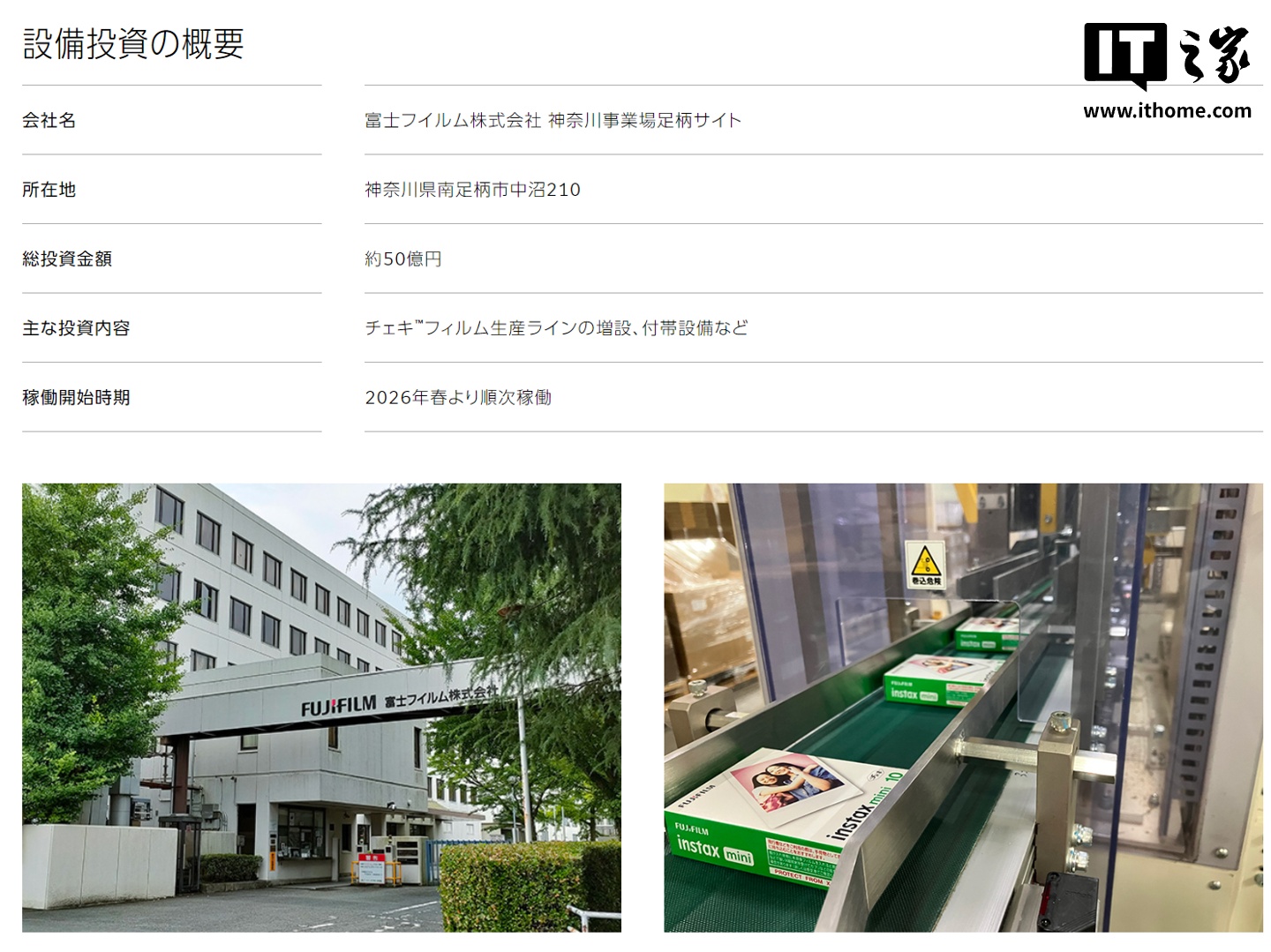 富士胶片将向日本神奈川县的工厂投资约 50 亿日元(IT之家注:现汇率约合 2.27 亿元人民币),此次增强的生产设备将于 2026 年春季逐步投入使用,并计划在 2026 年秋季实现全面投产。全面投产后的生产能力将比 2025 年度提升约 10%。