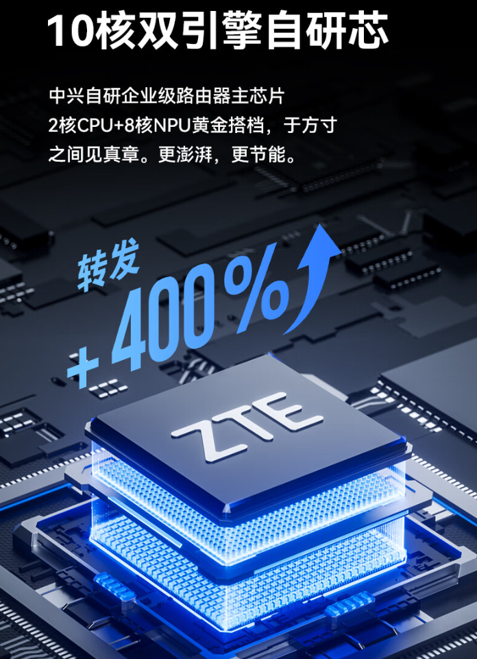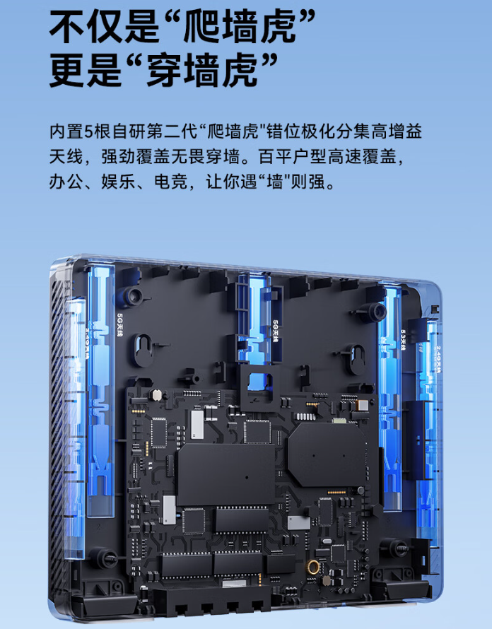 据介绍,中兴晴天 BE5100 墙面路由器采用自研 10 核双引擎芯片 + 6nm Wi-Fi 7 基带芯片,辅以“爬墙虎”高增益天线,支持 5100 兆无线速率。