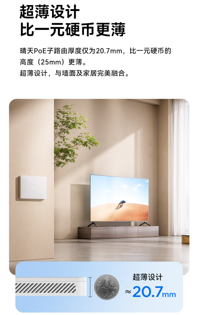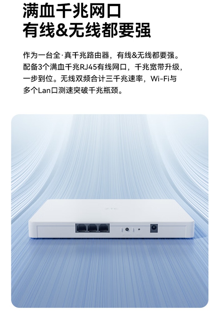 中兴晴天 BE5100 路由器厚度约 20.7mm,配备 3 个满血千兆 RJ45 有线网口;路由器内置管理功能,支持针对超 68 款 App 进行定向管理。
