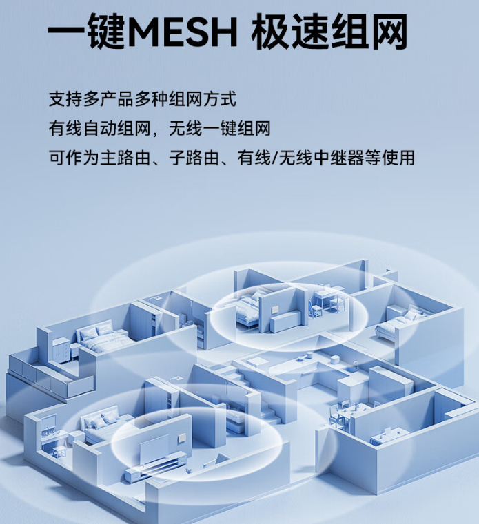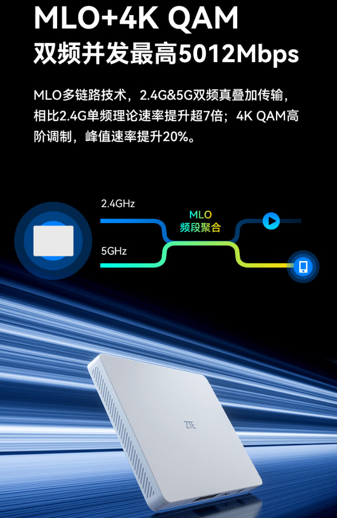 该款路由器内置 MLO 多链路技术,支持 2.4G&5G 双频真叠加传输,同时支持 4K QAM 高阶调制,峰值速率提升 20%。路由器还支持一键 MESH 组网。