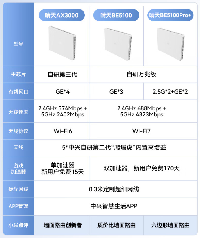 IT之家附中兴晴天 BE5100 墙面路由器亮点及晴天系列路由器对比如下: