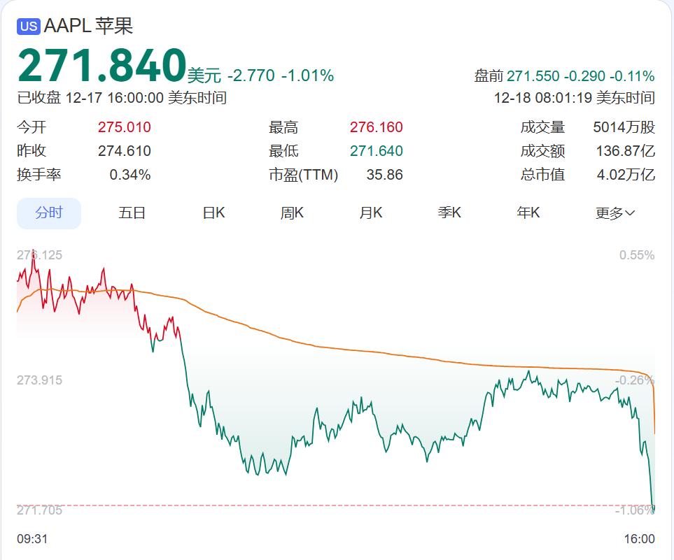 当地时间12月17日,苹果股价跌超1%,总市值4.02万亿美元。