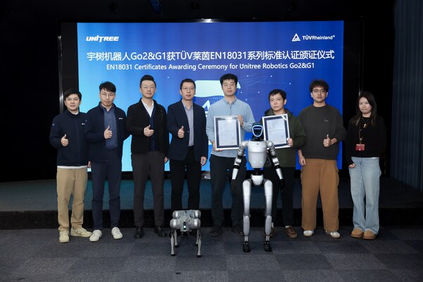 杭州2025年12月19日 /美通社/ -- 12月17日,国际独立第三方检测、检验和认证机构德国莱茵TÜV大中华区(简称"TÜV莱茵")为宇树科技股份有限公司(简称"宇树")旗下G1双足机器人和Go2机器狗颁发了基于EN 18031标准的网络安全符合性证书。