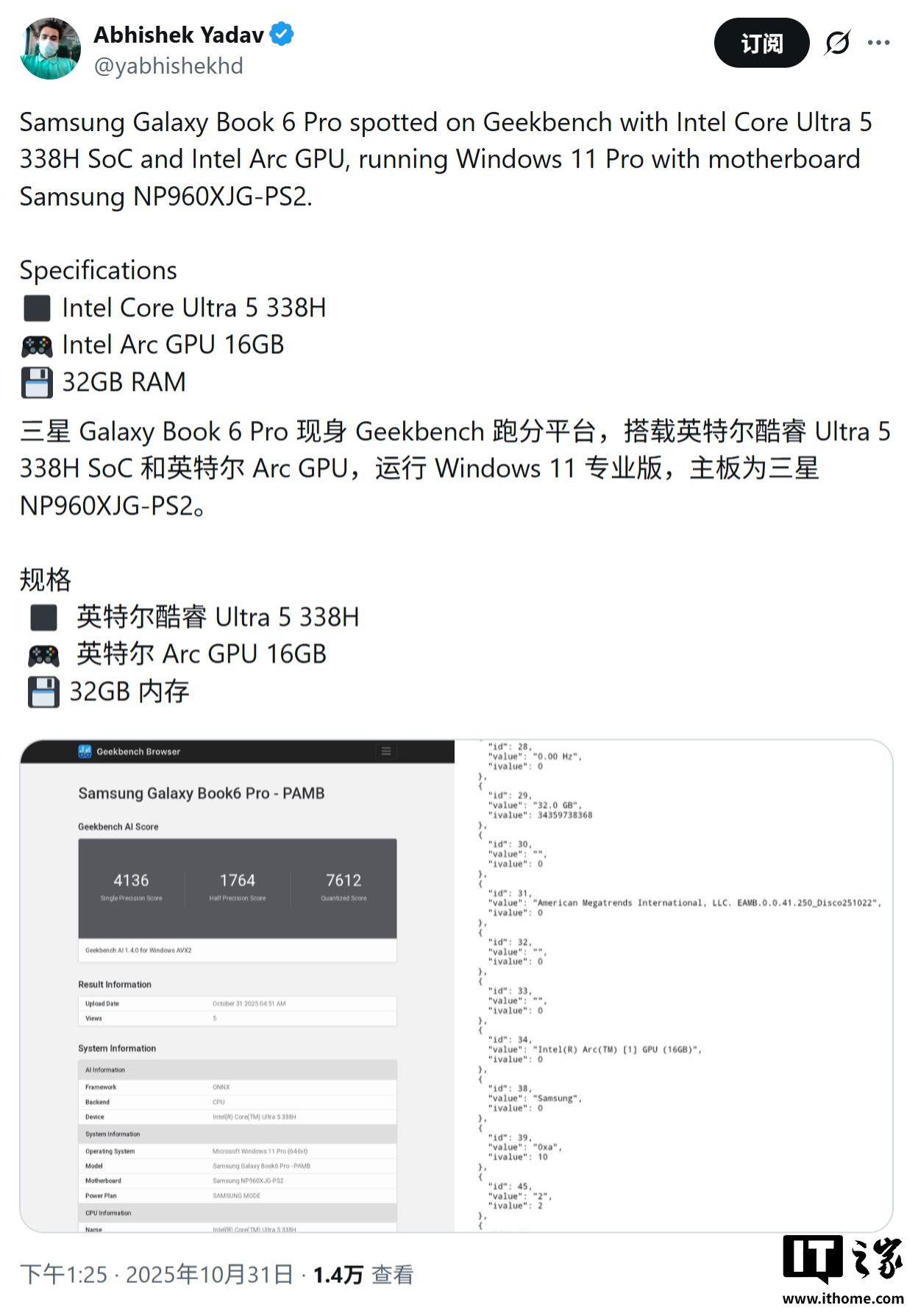 IT之家查询公开资料,三星 Galaxy Book6 Pro 此前已现身 GeekBench 跑分库,页面信息显示该笔记本搭载即将推出的下一代 Panther Lake 系列酷睿 Ultra 5 338H 处理器,它还将配备英特尔最新的 Arc B370 集成显卡,并集成 32GB 内存。