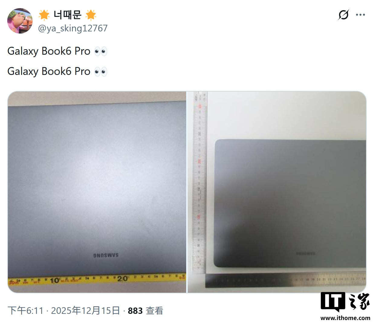 IT之家 12 月 19 日消息,消息源 @ya_sking12767 于 12 月 15 日在 X 平台发布推文,分享了两张认证图片,展示了三星 Galaxy Book 6 Pro 笔记本电脑,透露了该机的尺寸规格信息。