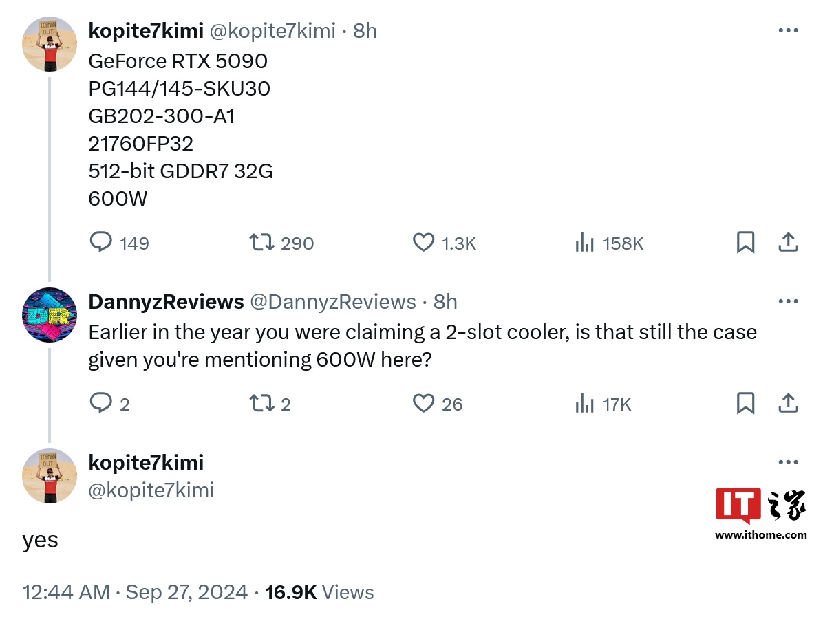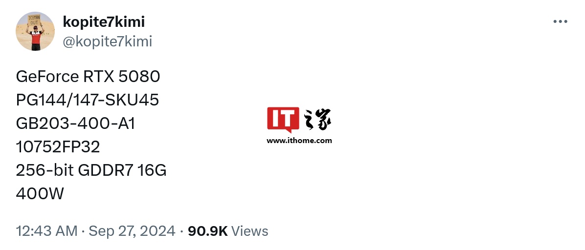 IT之家 9 月 27 日消息,X 平台消息人士 Kopite7kimi 北京时间今日曝光了英伟达 GeForce RTX 5090 / 5080 两张未来 Blackwell 世代高规格游戏显卡的详细规格。