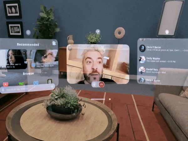 在真机体验中,The Verge 的编辑 Alex Heath ,通过 Orion 上的即时通讯软件 Messenger 和他人视频通话,对方漂浮在一个 2D 窗口里。