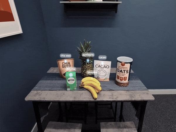 比如,用 Orion 的 AI 助手 Meta AI 识别桌子上摆放的食材,然后让 AI 给出一个制作冰沙的食谱。