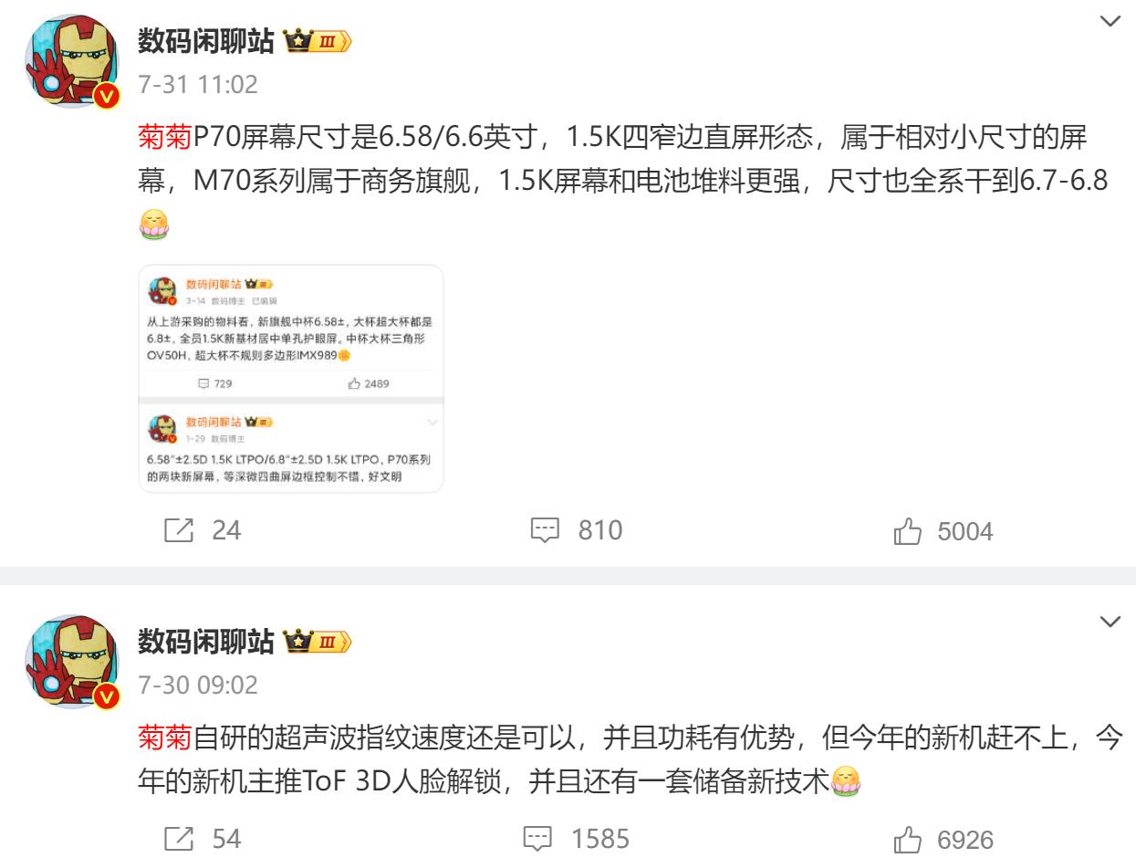 该博主还表示,Mate 70系列的屏幕尺寸为6.7英寸-6.8英寸,比Pura 70系列更大一些。遗憾的是,华为自研的超声波屏幕指纹解锁速度不低,且具有功耗优势,但今年的新机赶不上,可能仍会采用TOF 3D人脸解锁+短焦屏幕指纹解锁方案。
