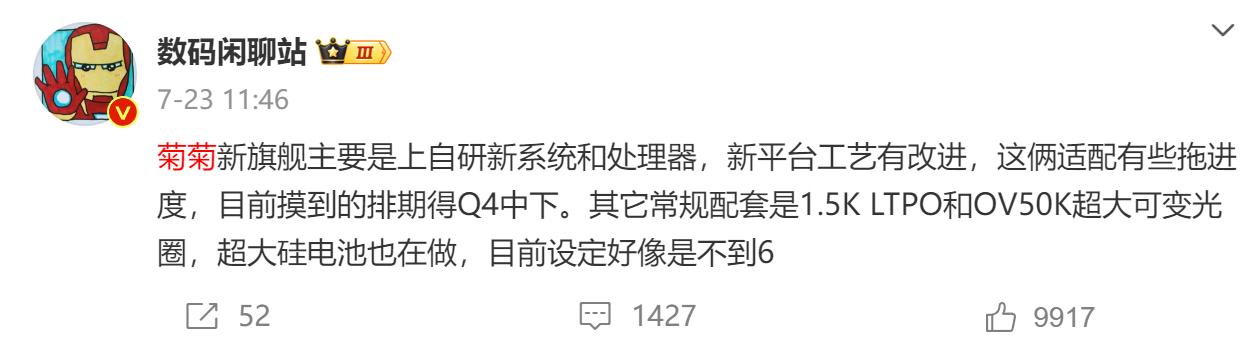 硬件配置方面,据@数码闲聊站爆料,Mate 70系列将搭载1.5K LTPO屏幕、自研处理器、豪威科技的OV50K超大可变光圈CMOS,电池容量不会超过6000mAh。