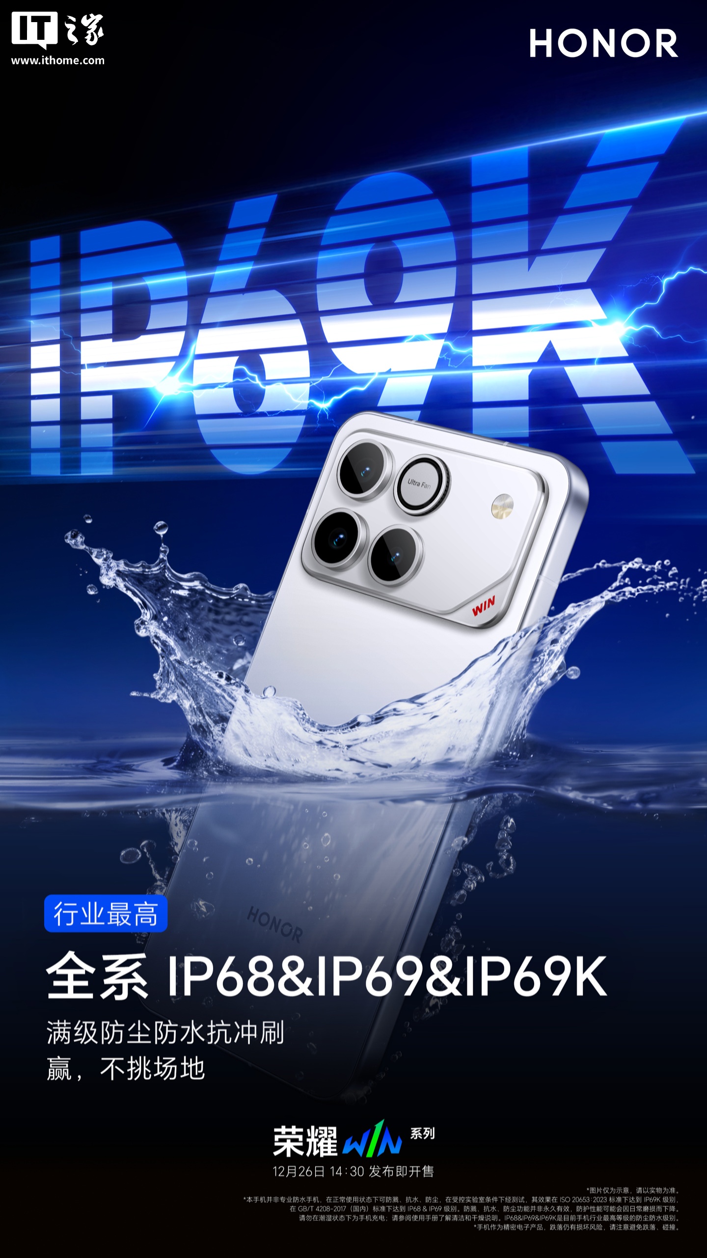 据介绍,荣耀 WIN 将全系支持 IP68/IP69/IP69K 防尘防水,可抵御汗水浸湿、雨水冲刷,甚至还能做个“高温 SPA”,可应对生活泼溅、户外极限等意外情况,防水性能号称“行业最高”。