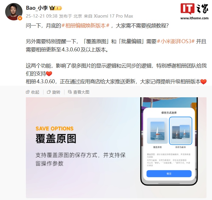 小米相机部的产品经理 @Bao_小李 今日还发文提醒,称「覆盖原图」和「批量编辑」需要小米澎湃 OS 3 系统,并且需要相册更新至 4.3.0.60 及以上版本。他表示,这两个功能,影响了很多图片的显示逻辑和云同步的逻辑。