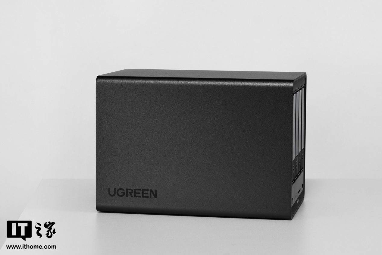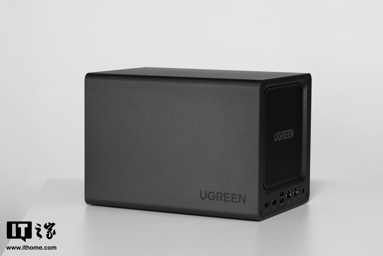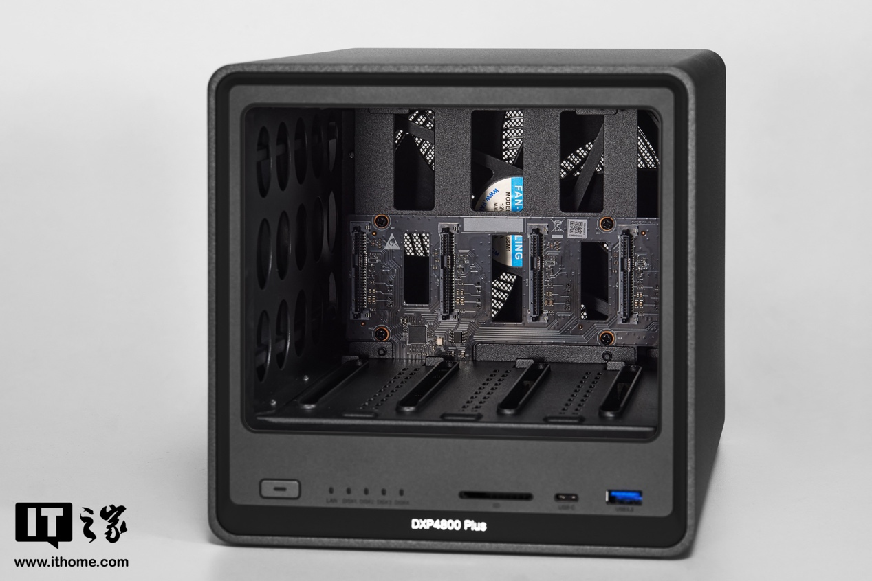 背面是风扇进风口,DXP4800Plus 采用单风扇后进前出设计,机身侧面没有多余的开孔。值得一提的是,CPU 还有单独的风扇增强散热,配置确实很可以了。
