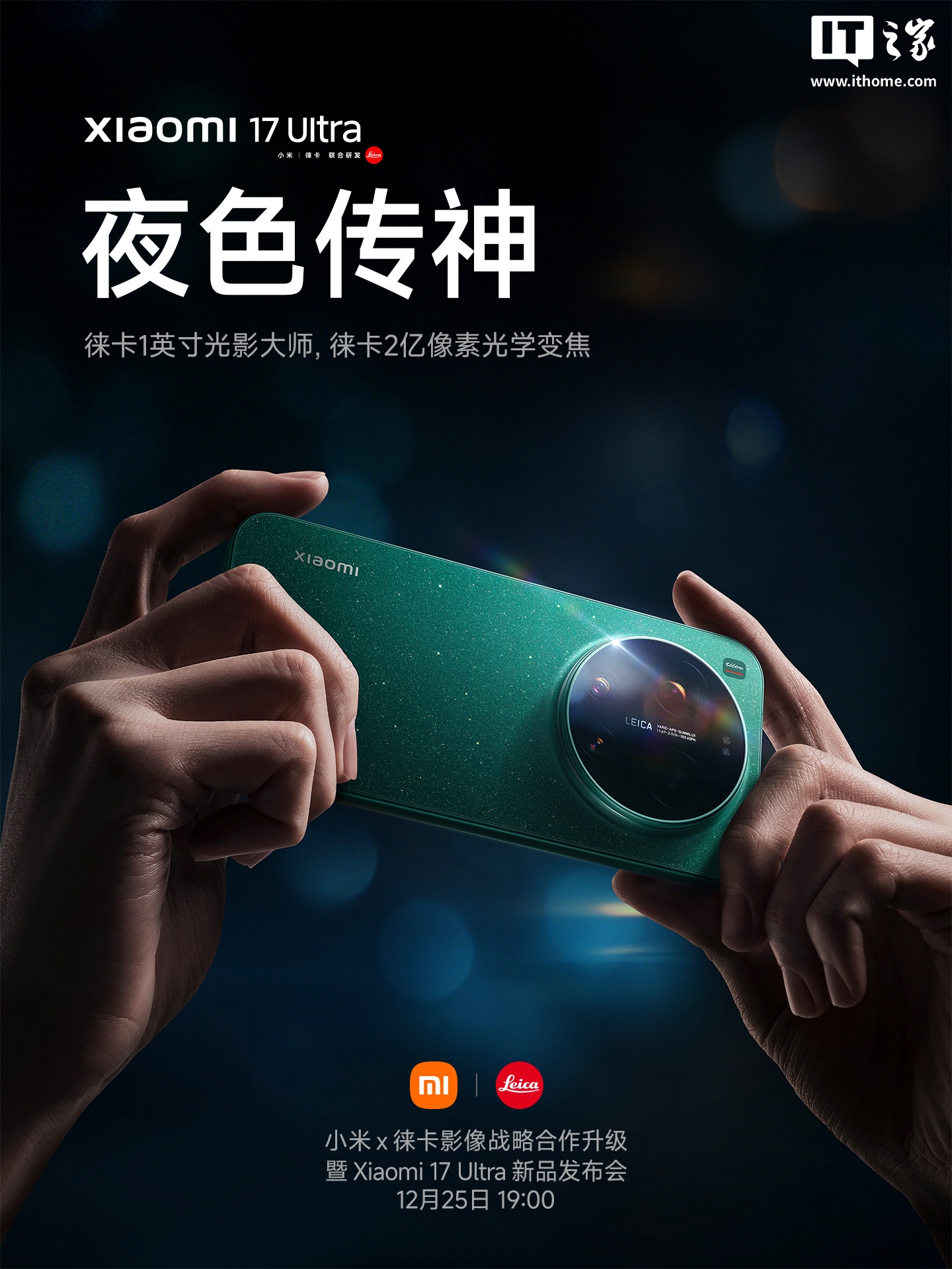 小米 × 徕卡影像战略合作升级暨 Xiaomi 17 Ultra 新品发布会定档 12 月 25 日 19:00,小米官方表示,小米 x 徕卡影像战略合作升级,“新一代小米夜神,小米 17 Ultra 同步登场,长焦光学系统将有颠覆性的创新,夜景画质表现迎来巨大跨越”。