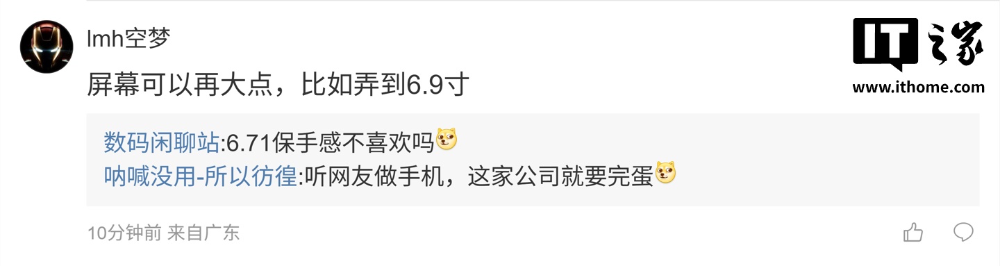 后续有用户在评论区询问:“影像优势在哪里?这些外围配置跟 Pro 没多大区别”,博主回复道:“新的主摄和 2 亿潜望”;另一名用户则询表示:“屏幕可以再大点,比如弄到 6.9 寸”,博主回复道:“6.71 保手感不喜欢吗”。