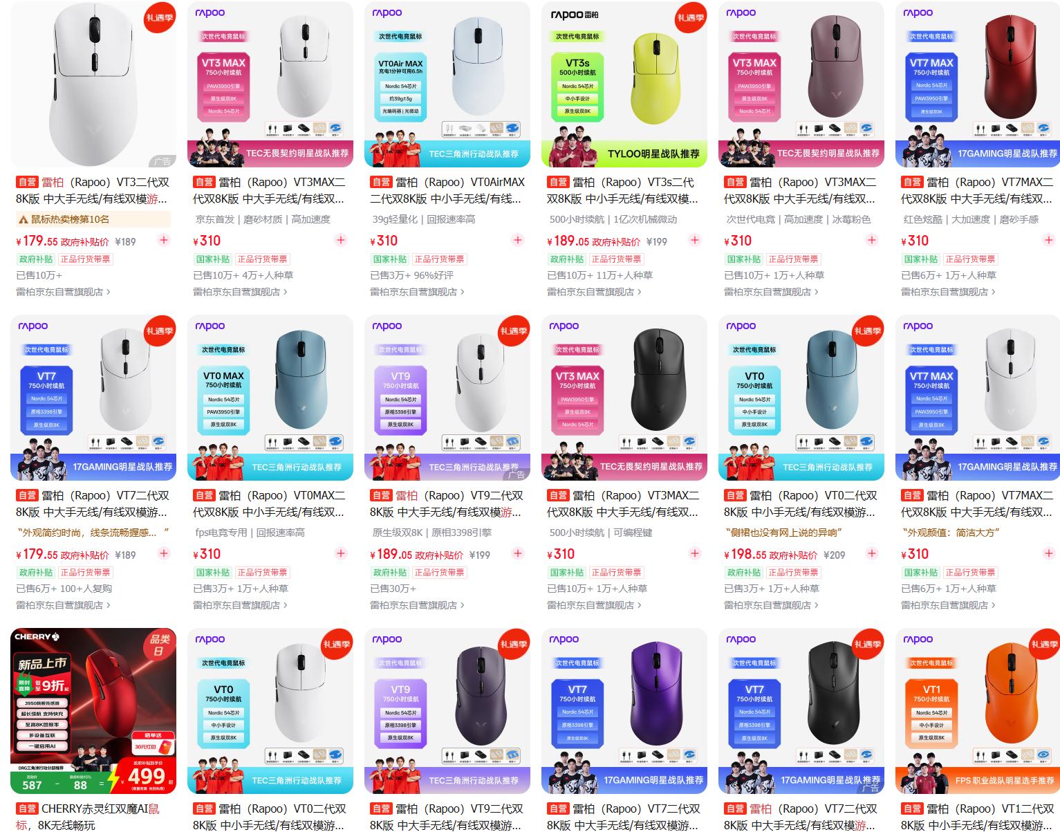 以雷柏为例,他们的VT系列游戏鼠标在今年就推出了超过5款的新产品,覆盖不同手型、不同惯用手以及不同的游戏玩家,并且每一个型号都有不同的配置版本。在基础配置接近的前提下,它们主要通过续航、无线传输码率等参数拉开档位,价格从100到400不等,直接覆盖主流的游戏鼠标价位。