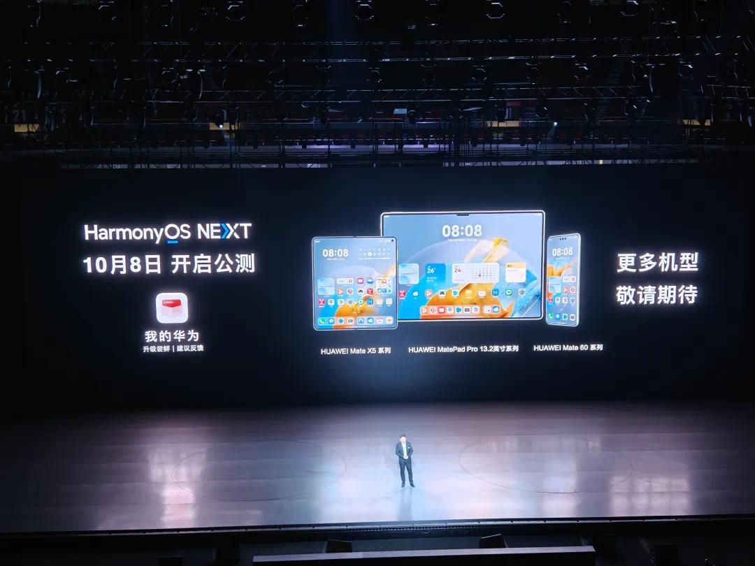 日前举办的华为秋季全场景新品发布会上,华为常务董事、终端BG董事长余承东宣布,纯血版鸿蒙HarmonyOS NEXT将于10月8日开启公测,Mate X5系列、MatePad Pro 13.2系列、Mate 60系列为首批公测设备。