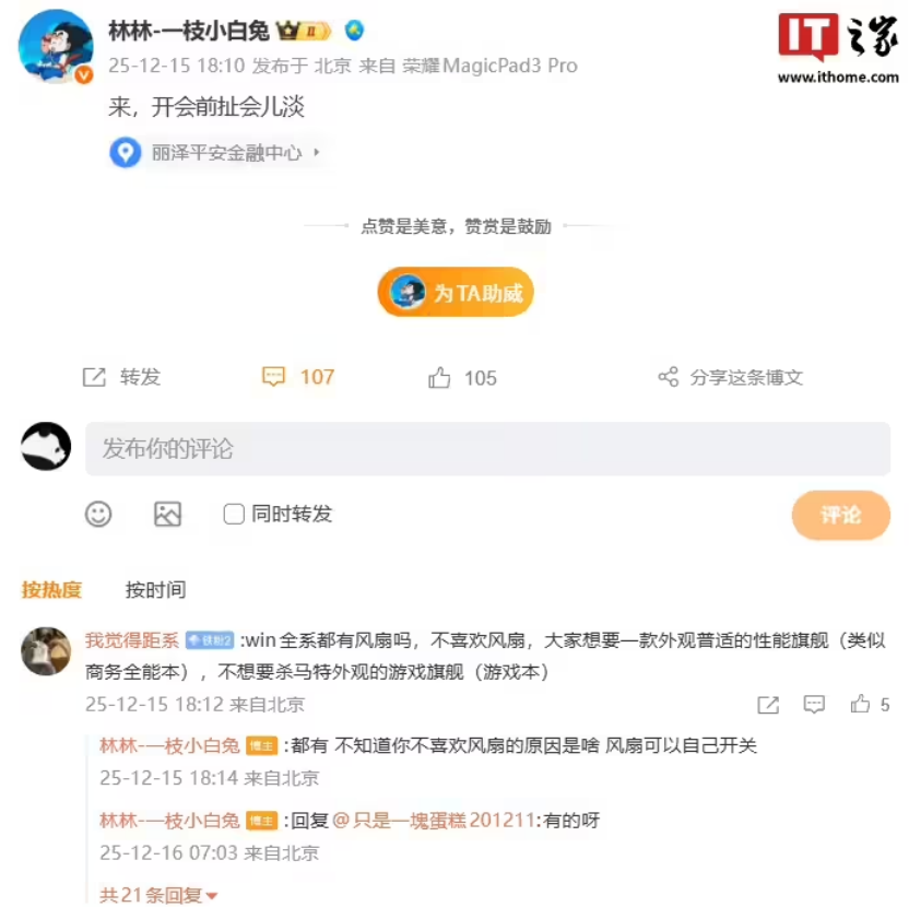 值得一提的是,荣耀 WIN 系列全系采用了内置风扇设计,且风扇支持开关调节。这种“物理外挂”般的散热配置,配合荣耀幻影引擎 3.0 的软件调校,让荣耀 WIN 系列在长时间高负载游戏中也能保持“冷静”,真正做到了性能释放无死角。