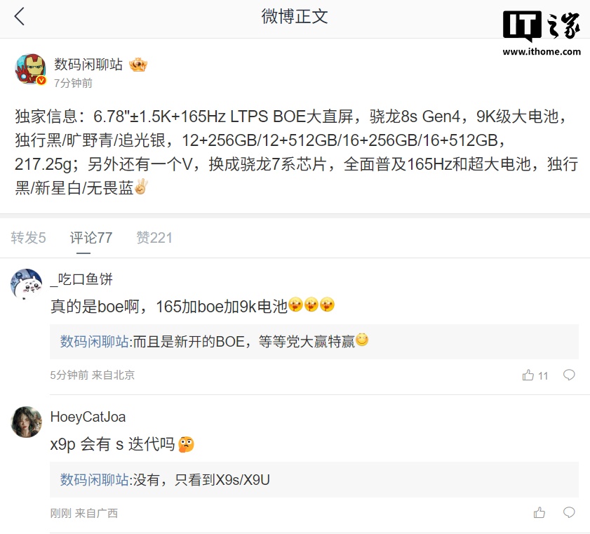 该博主还称:“另外还有一个 V,换成骁龙 7 系芯片,全面普及 165Hz 和超大电池,独行黑 / 新星白 / 无畏蓝。”
