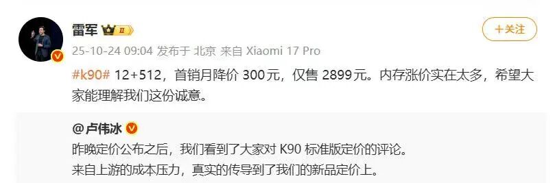 成本上涨导致利润空间被压缩的挑战最为严峻。雷军、卢伟冰等手机厂商的高管就曾在微博上“吐槽”,称2025年智能手机成本上涨幅度将会非常惊人。