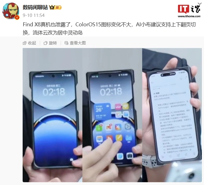 周意保曾在 9 月 9 日的直播中,展示一款带黑色保护壳的新机。博主 @数码闲聊站 称其为 OPPO Find X8。该手机 UI 风格与当前版本的 ColorOS 14 类似,桌面小布建议支持滑动翻页切换。另外,手机前摄区域显示有应用实时活动,博主称“流体云改为居中灵动岛”。