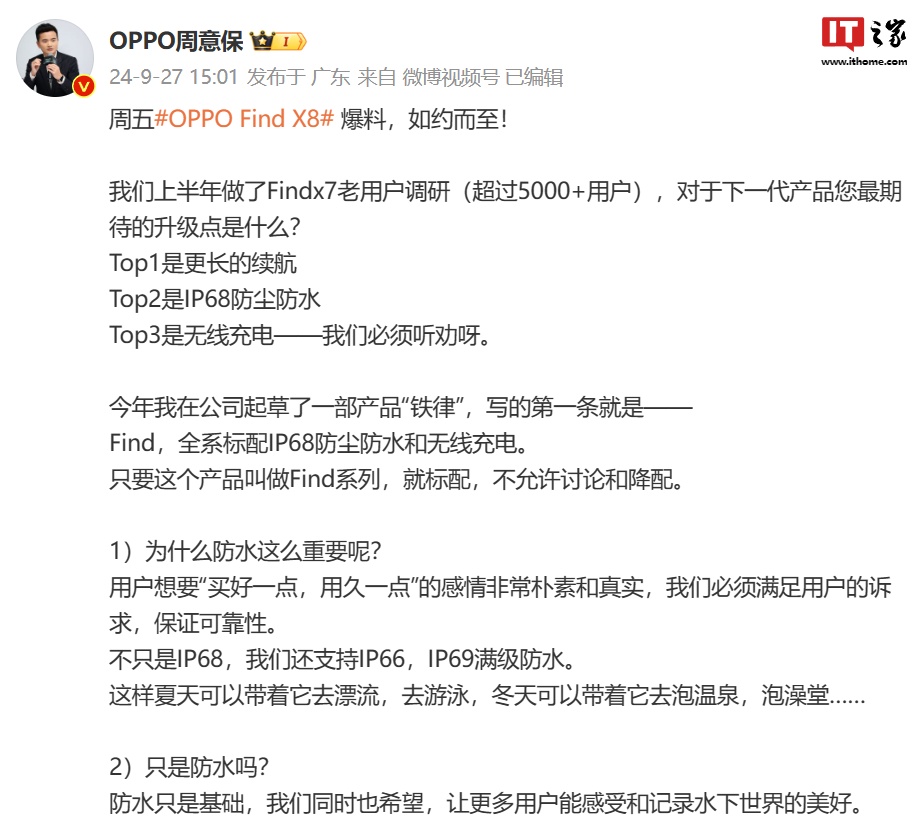 IT之家 9 月 27 日消息,OPPO Find 系列产品负责人周意保今日透露,Find 全系标配 IP68 防尘防水和无线充电。