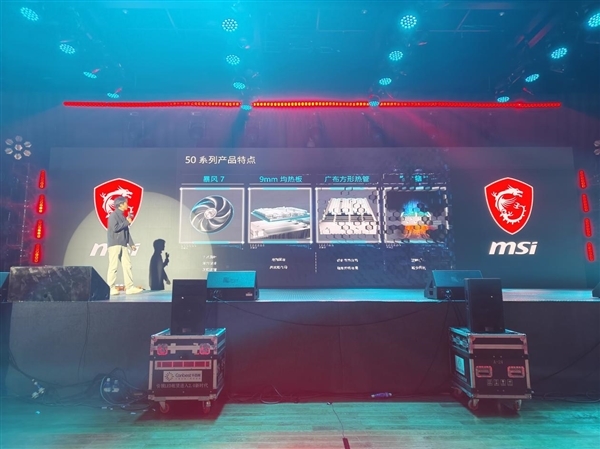至于显卡,微星产品经理高志远主要介绍了目前最新一代RTX 50显卡的通用设计,如散热风扇从RTX 40系列的刀锋7代升级为暴风7,气流通过量增加14.7%,气压通过增强31.1%。均热板从7mm升级到9mm均热板,热管也升级为广布方形热管,接触面积更大,散热更强。