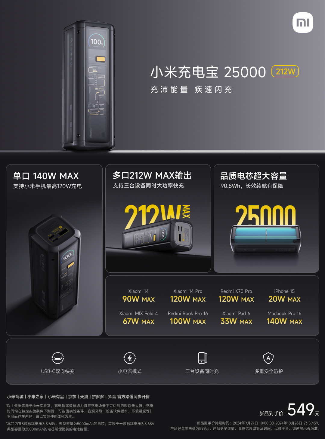 IT之家 9 月 27 日消息,在众筹一个月之后,小米充电宝 25000 212W 今日正式公开发售,建议零售价 599 元,新品到手价 549 元。