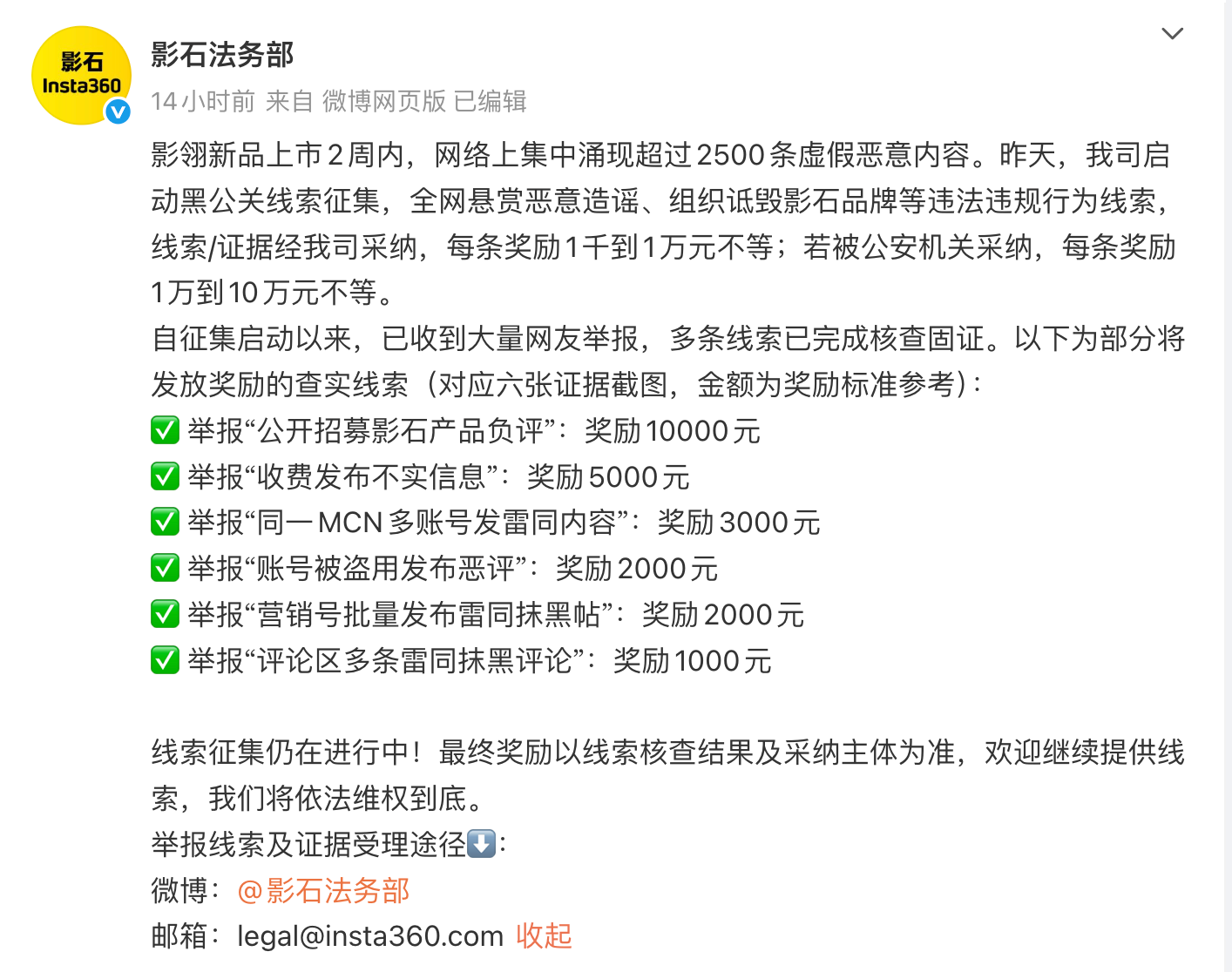 影石官方还晒出了部分将发放奖励的查实线索,其中举报“公开招募影石产品负评”奖励10000元;举报“收费发布不实信息”奖励5000元等。