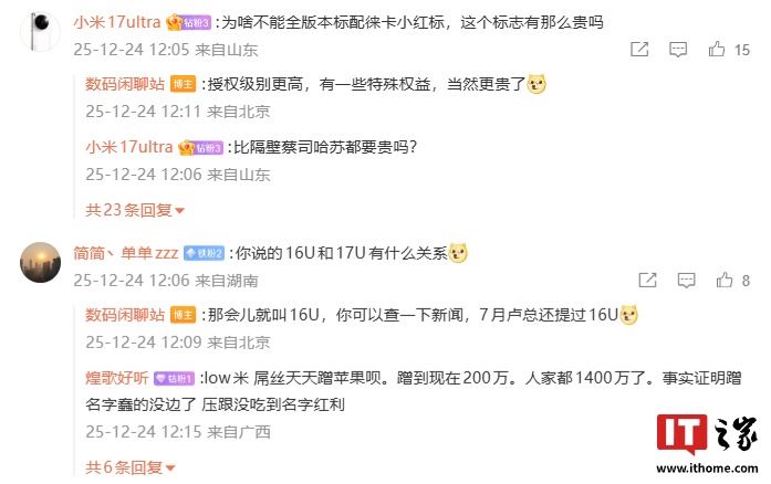 IT之家注意到,有网友向博主询问为什么不能全版本标配徕卡小红标,他回复:“授权级别更高,有一些特殊权益,当然更贵了。”另外,博主还解释了小米 16 Ultra 和小米 17 Ultra 的关系:“那会儿就叫 16U,你可以查一下新闻,7 月卢总还提过 16U。”