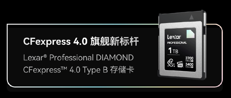 Lexar Professional DIAMOND CFexpress 4.0 Type B 存储卡采用 PCIe 4.0 协议传输标准,其读取速度达到 3700MB/s,写入速度达 3400MB/s,持续写入不低于 3200MB/s,帮助摄影师捕捉 8K RAW 电影级视频。