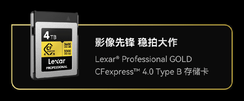 Lexar Professional GOLD CFexpress 4.0 Type B 存储卡同样支持录制 8K RAW 60P 超高清视频,并提供最高 4TB 的多容量选择。