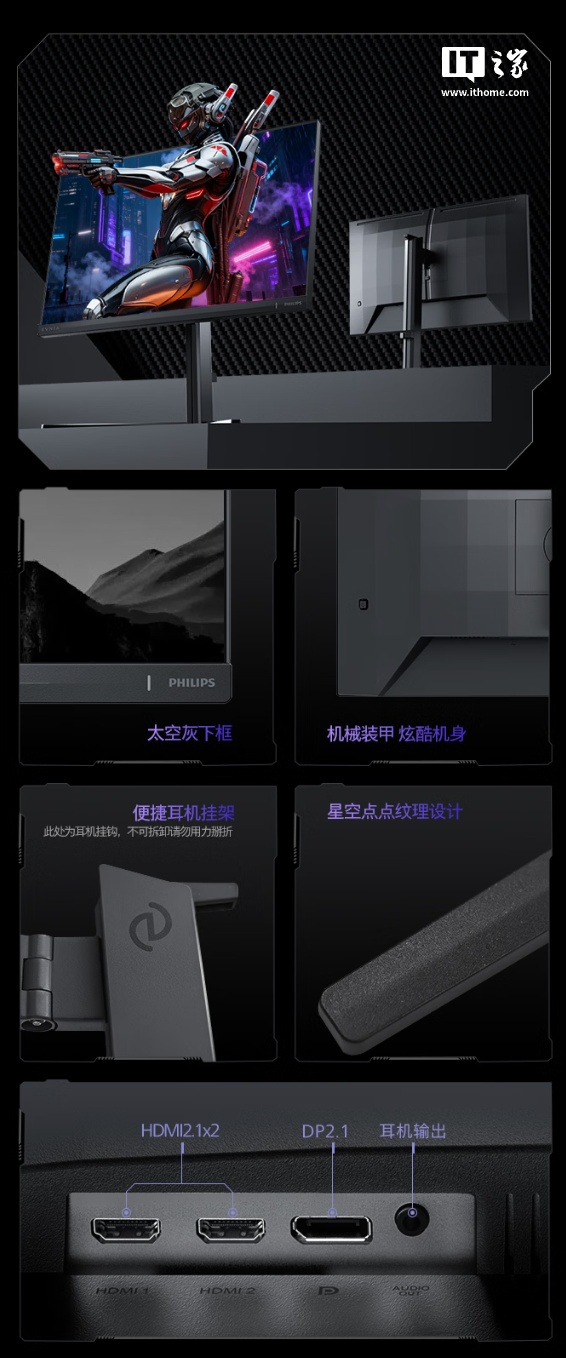 该机支架支持升降 / 倾斜 / 旋转,显示器本体支持 VESA 100x100mm 壁挂,提供 2 个 HDMI 2.1、1 个 DP 2.1 接口。